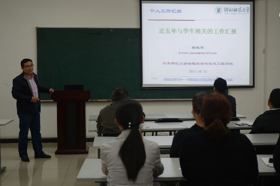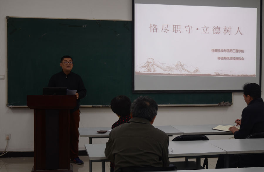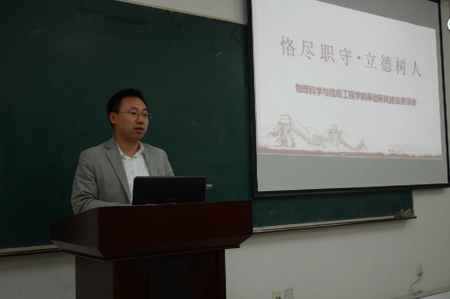 10月12日下午,我院在理科群2-A302教室召开了以“恪尽职守,立德树人”为主题的师德师风建设报告会。院长张书敏主持报告会,宋俊涛、杨振军、康建波三位教师代表发言,全院教职员工参加了报告会。