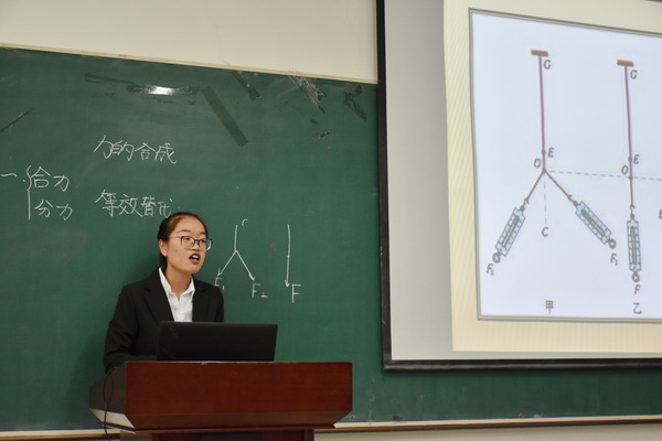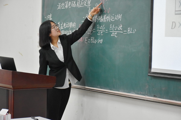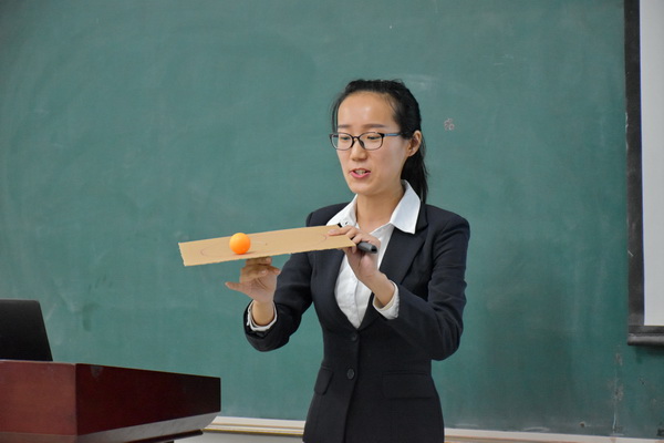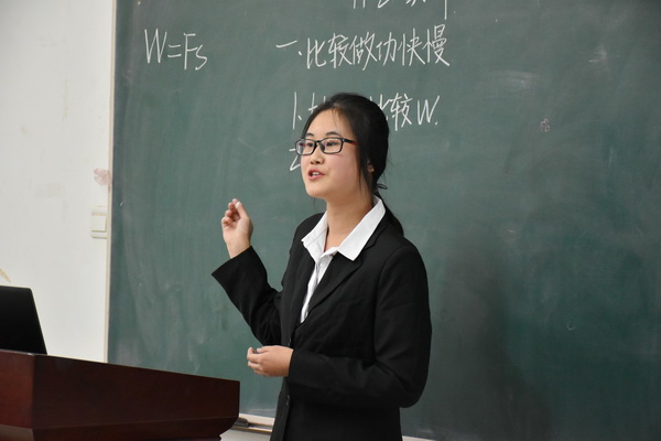 比赛分为教学设计、模拟授课、现场问答三个环节。评委老师根据参赛选手在教学设计、课堂组织、授课方法、教风教态以及课堂应变等多方面表现进行现场打分。参加比赛的十一名同学都是经过班级初赛选拔出来的,个个身手不凡,他们教态得体,教学语言流畅幽默、富有感染力,板书书写规范,授课技巧娴熟精湛,授课重点、难点突出,教学过程新颖流畅,结合新课标的教学要求,从课本内容,或从学生动手实验出发,综合运用探究、合作等教学理念,利用板书和多媒体等教学手段,充分展现了我院师范生较强的教学技能和良好的教师修养。参赛选手清晰明了的授课思路、各具特色的教学风格、优美的课件设计赢得了现场观众的阵阵掌声。