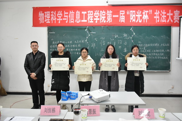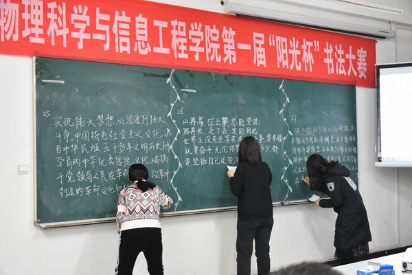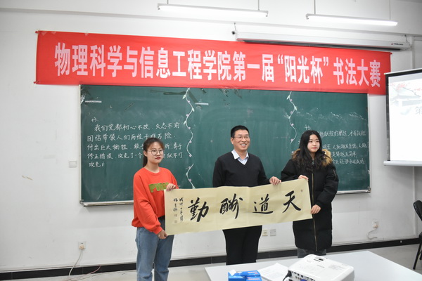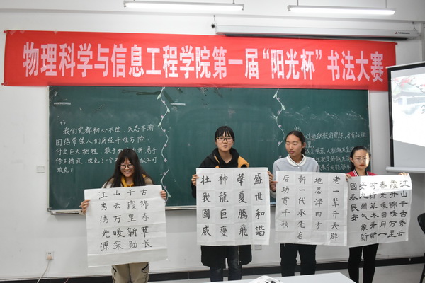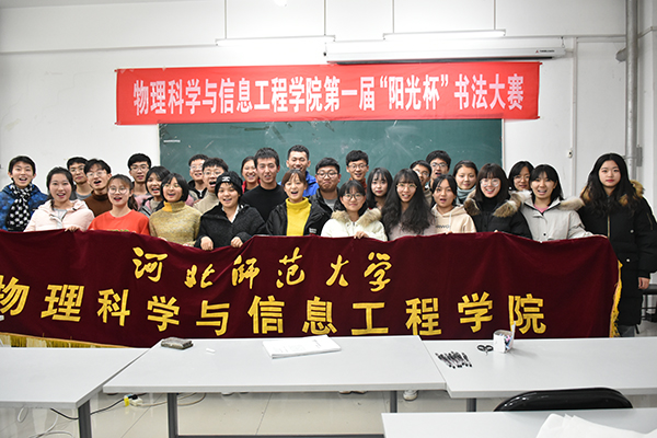 12月6日,学院在理科群楼2号楼A302举办了首届“阳光杯”书法大赛。比赛特邀信息技术学院副院长杨景振、国际交流学院办公室主任史洪存、阳光教育集团创始人刘好宽、中国未来教师协会会长刘恒栋等担任评委;校团委书记马建国、学院中学物理教育教学部主任魏国强莅临指导,学院书法爱好者共计90余人观看了比赛。