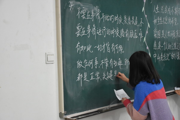 日本a片 一直致力于学生全面发展,重视学风建设,开展了以就业质量提升为目的的第二课堂活动,安排专业老师为同学们练习板书、普通话、讲课技能进行指导。此次活动为同学们提供了相互切磋、展示自我的平台,加深了同学们对书法的认识和了解,提升了同学们的艺术修养和审美能力。
