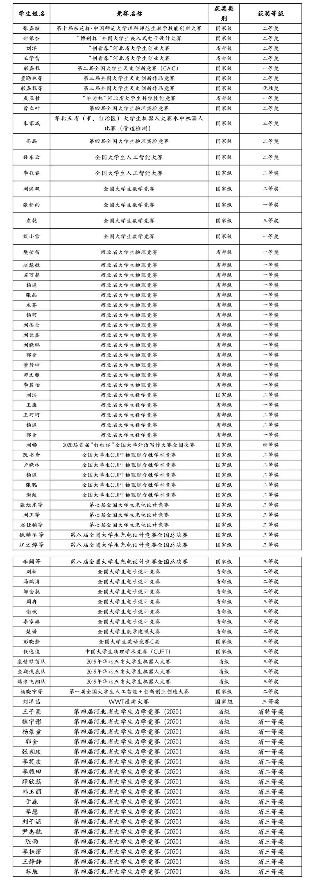 学院始终坚持育人为本、素质为先的人才培养理念;采取“导师-研究生-本科生”三位一体的人才培养模式,形成了从基础知识学习到科技创新实践、从实验室探索到实习基地实训、从教学基本功训练到进名校高中实习,本科生都深度参与并走向前台的特色文化;形成了高升学率、高端就业的良好局面。我院获得河北师范大学2020年度本科毕业生就业工作先进集体、硕博毕业生就业工作先进集体、创业工作先进集体3项集体荣誉。