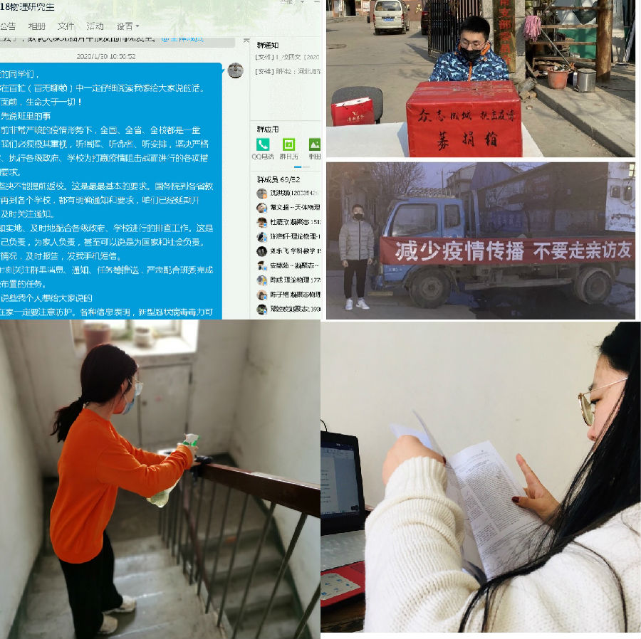 严格落实学校要求。按照学校疫情防控工作部署,全体研究生党员带头遵守延迟开学规定,并第一时间利用微信群和班级同学结对,及时传达上级文件精神,排班统计学生健康状况;协调处理学生关切的问题,有效落实学校、学院防关于疫情防控的各项任务;带头宣传疫情防控科学知识,为全体研究生平安顺利返回学校做好保障。