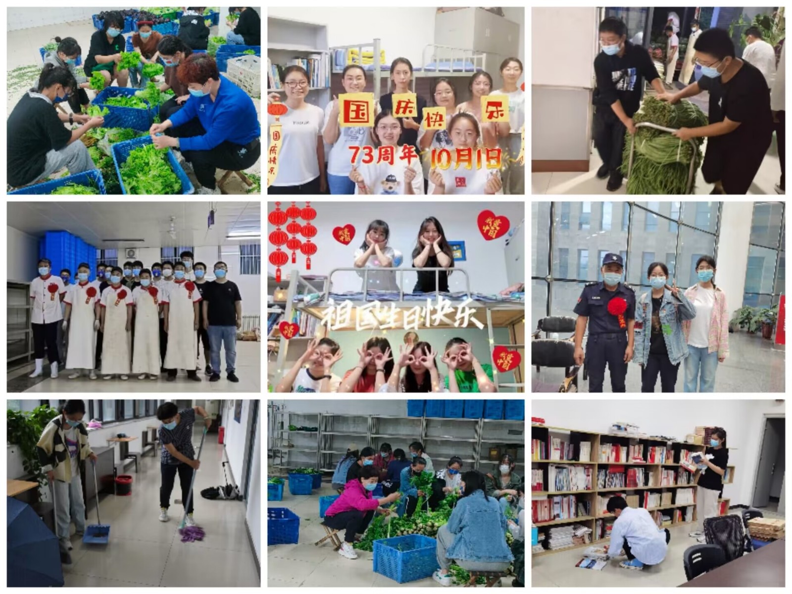 活动设“‘一屋不扫何以扫天下’——用行动诠释爱校之情”“‘谁说站在光里的才算英雄’——义务劳动,致敬最美劳动者”“师生同心,共克疫情——‘我和国旗合个影’打卡校内红色景观”“跃动青春10·1·73——师生健步走”四部分,涉及宿舍卫生整理及评比、义务劳动、慰问教职工、师生联谊等方面,特别是在助工餐饮中心和寻访校园劳动者的活动中,同学们从清晨6点开始协助餐厅师傅卸菜、择菜、洗菜,慰问节日期间仍坚持工作的保洁、绿化、维修人员,亲身感受到了校园的和谐安宁离不开广大普通劳动者的付出和努力,也进一步体悟到了劳动的不易与光荣。