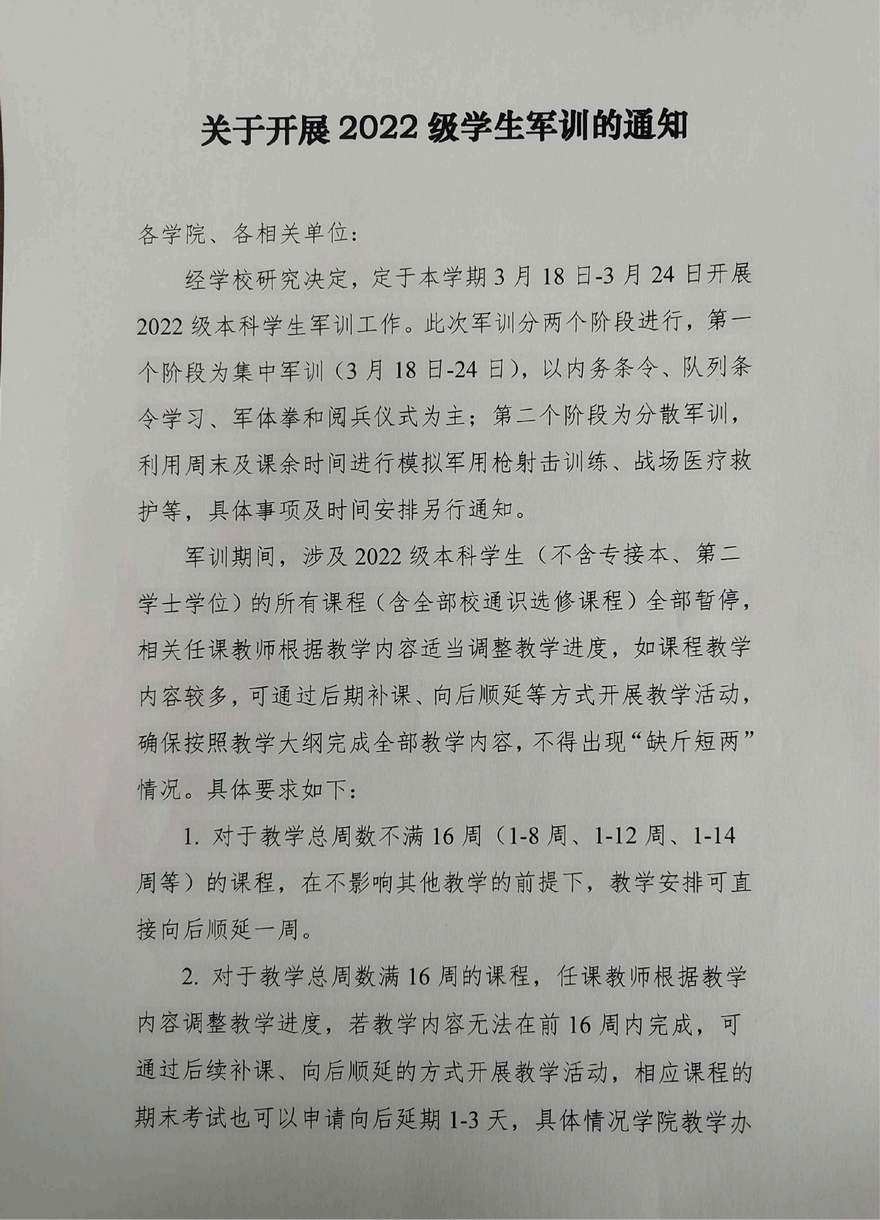 关于开展2022级学生军训的通知