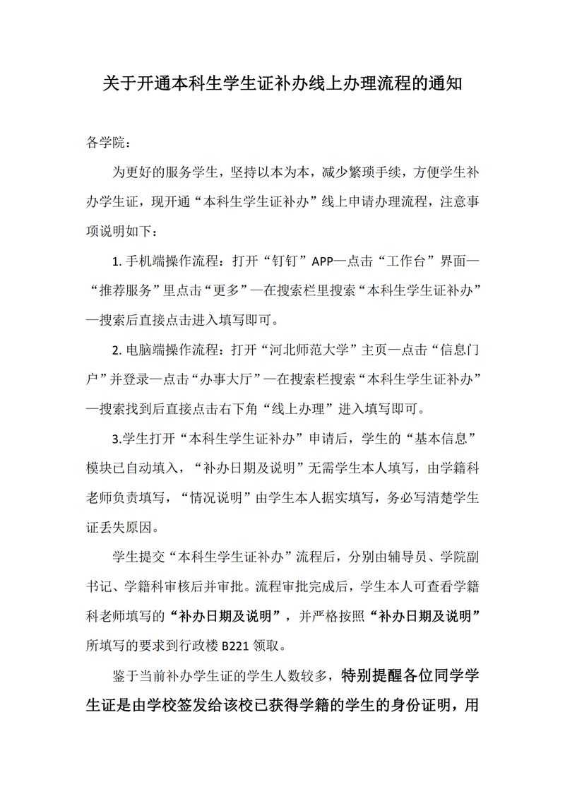 关于开通本科生学生证补办线上办理流程的通知