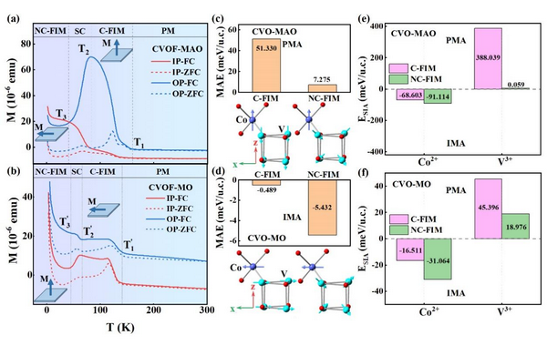 CoV2O4薄膜受压缩应力(a)和拉伸应力(b)的面内和面外场冷(FC)和零场冷(ZFC)曲线;CoV2O4薄膜受压缩应力(c)和拉伸应力(d)在共线亚铁磁和非共线亚铁磁态Co2+和V3+的磁晶各向异性能量和相应的自旋态示意图;CoV2O4薄膜受压缩应力(e)和拉伸应力(f)的单离子各向异性能。