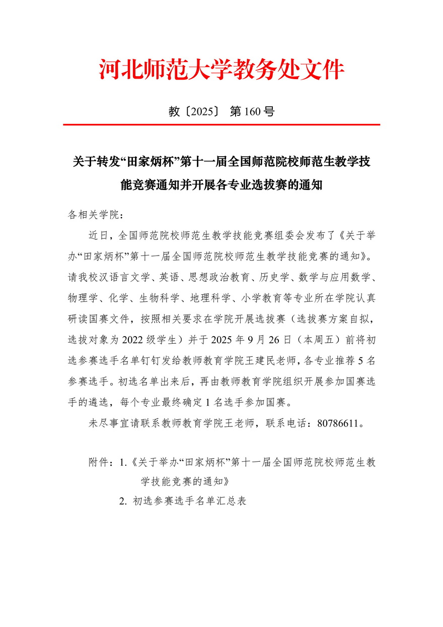 关于转发“田家炳杯”第十一届全国师范院校师范生教学技能竞赛通知并开展各专业选拔赛的通知